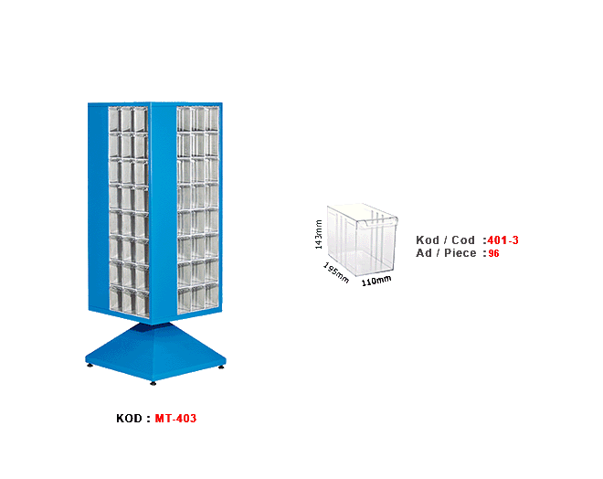 96 Plastik çekmeceli kutulu, dört yönlü dönen metal gövdeli dolap