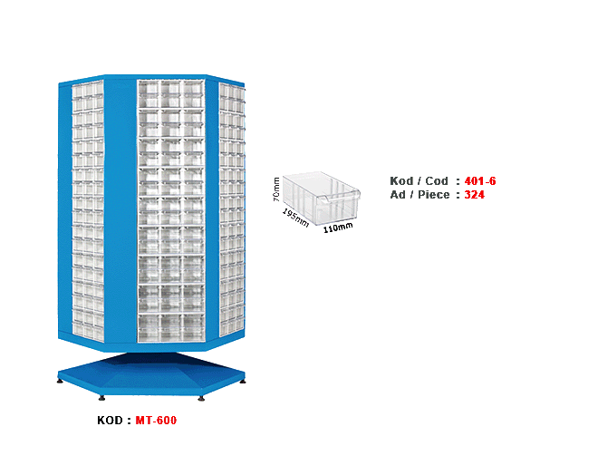 324 Plastik çekmeceli kutulu, altı yönlü dönen metal gövdeli dolap