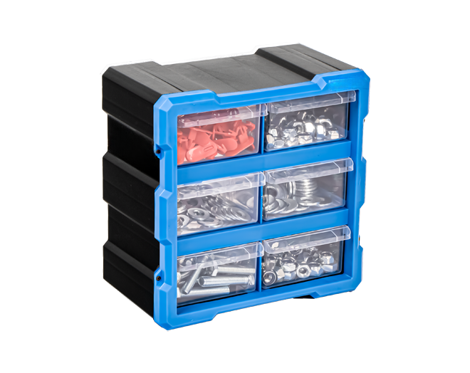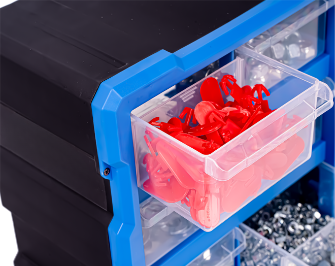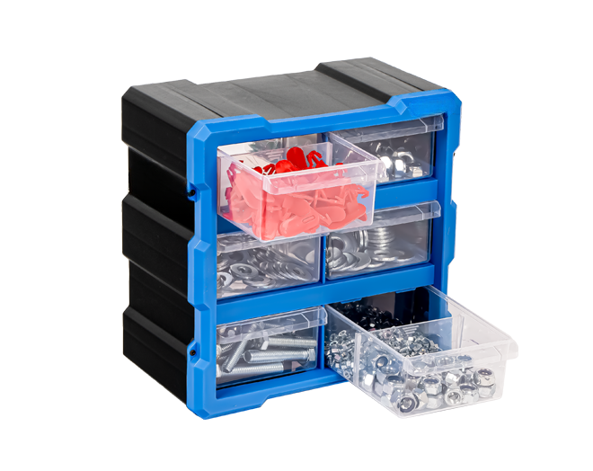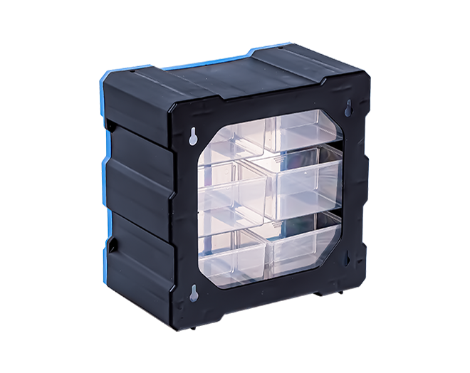 Renk: Gövde siyah, ön çerçeve mavi ve çekmeceler şeffaf