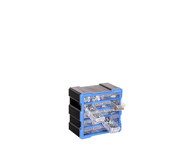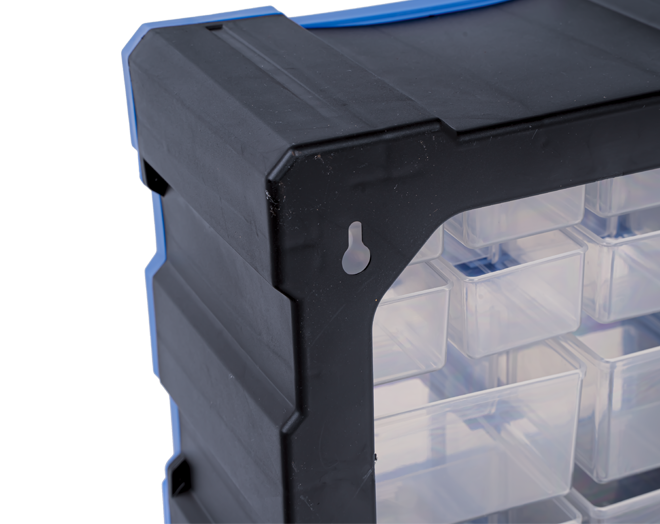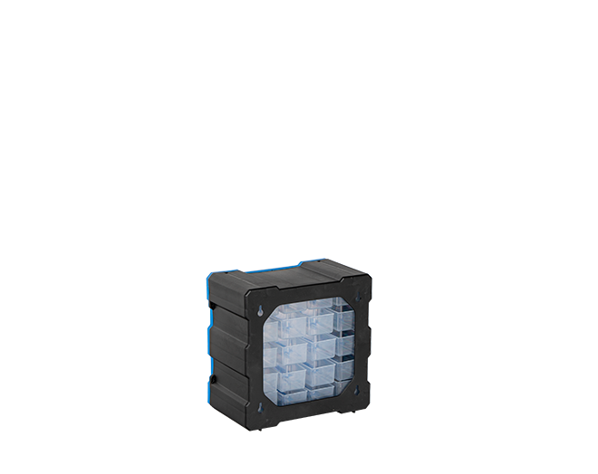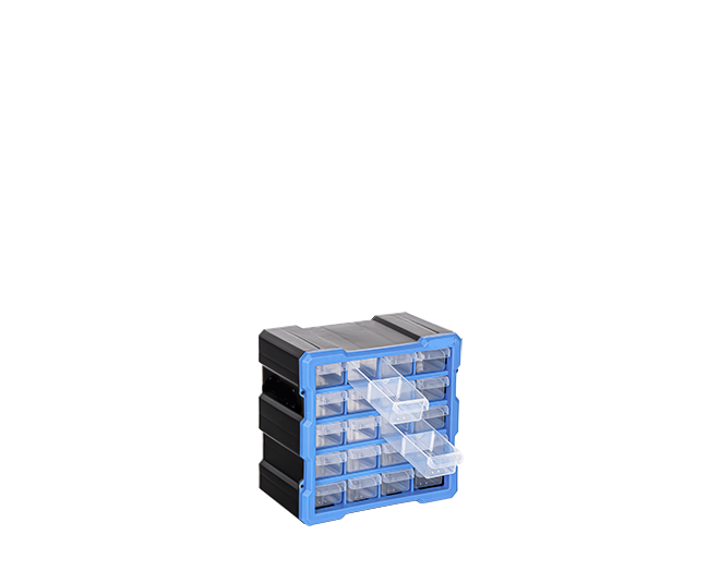 Renk: Gövde siyah, ön çerçeve mavi ve çekmeceler şeffaf