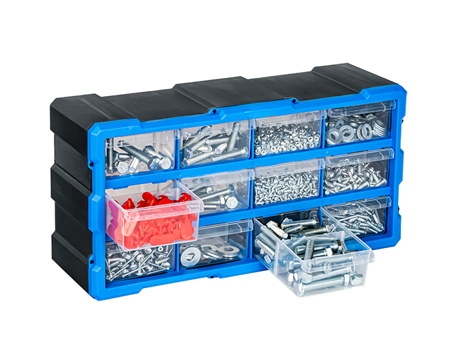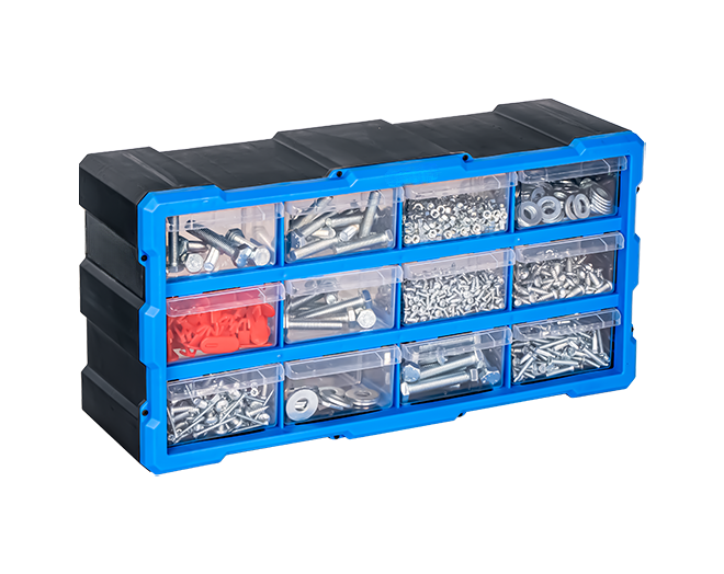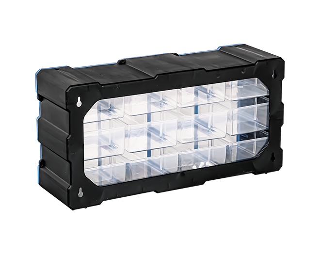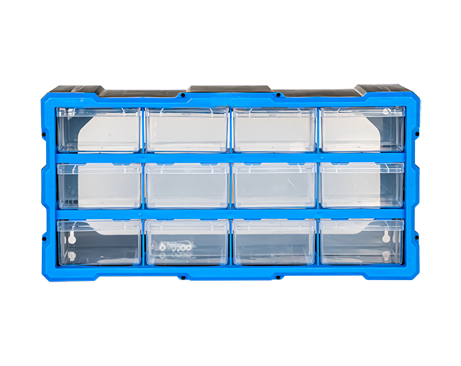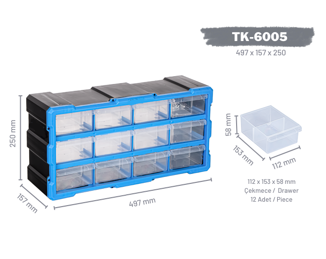 TK-6005 monoblok çekmeceli kutu 12 Adet 112 x 153 x 58 mm ölçülerinde çekmeceye sahip olup istenilirse çekmecelerin arasıda ki seperetörler ile bölünebilmektedir.