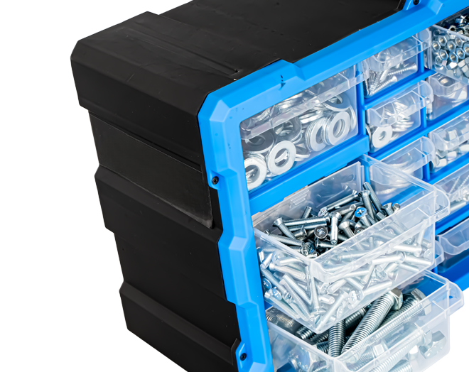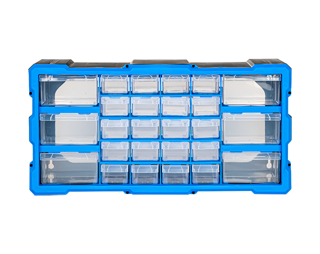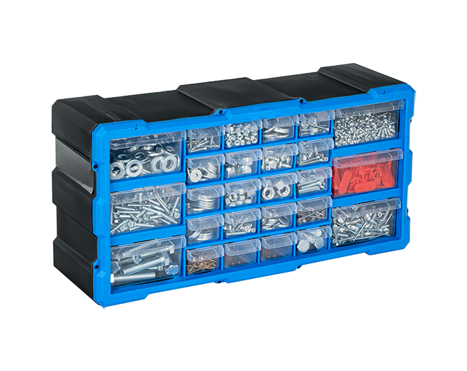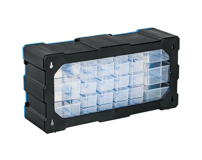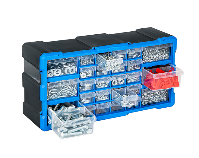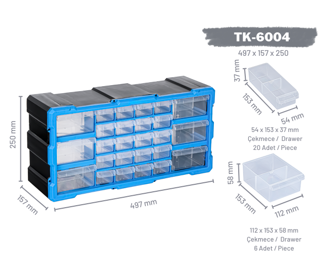 20 Adet 54x153x37 mm ve 6 Adet 112 x 153 x 58 mm toplam 26 çekmecelidir.
